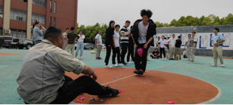 第二项进行的是“合力吹气球”,共有六组参加,每组4人,每个人分工不同,吹、扎、运、破,完整的运送5个气球并用屁股坐破所用的时间最短为获胜。这个项目不仅考验体力活、手工活,还考验足够强大的肺活量。