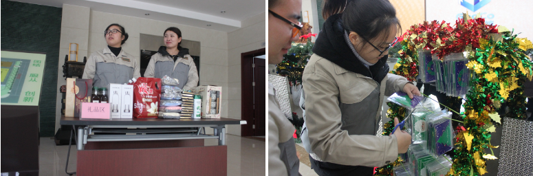 整个活动现场全程的为大家播放有关的圣诞歌曲,烘托了现在气氛,最热闹、激动人心的是抽奖环节,每个奖品都写在贺卡里,贺卡里有实物奖和新年祝福语!